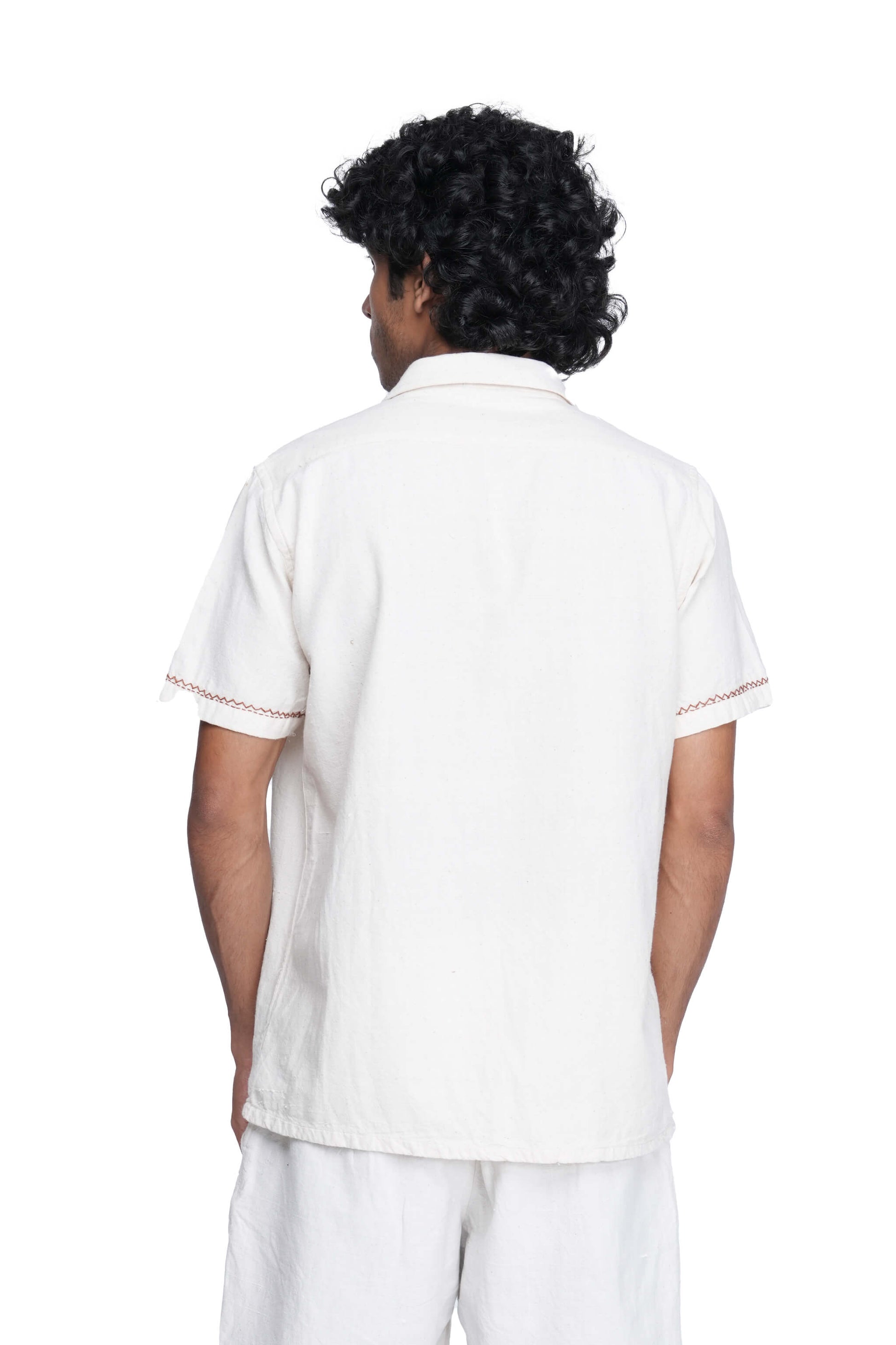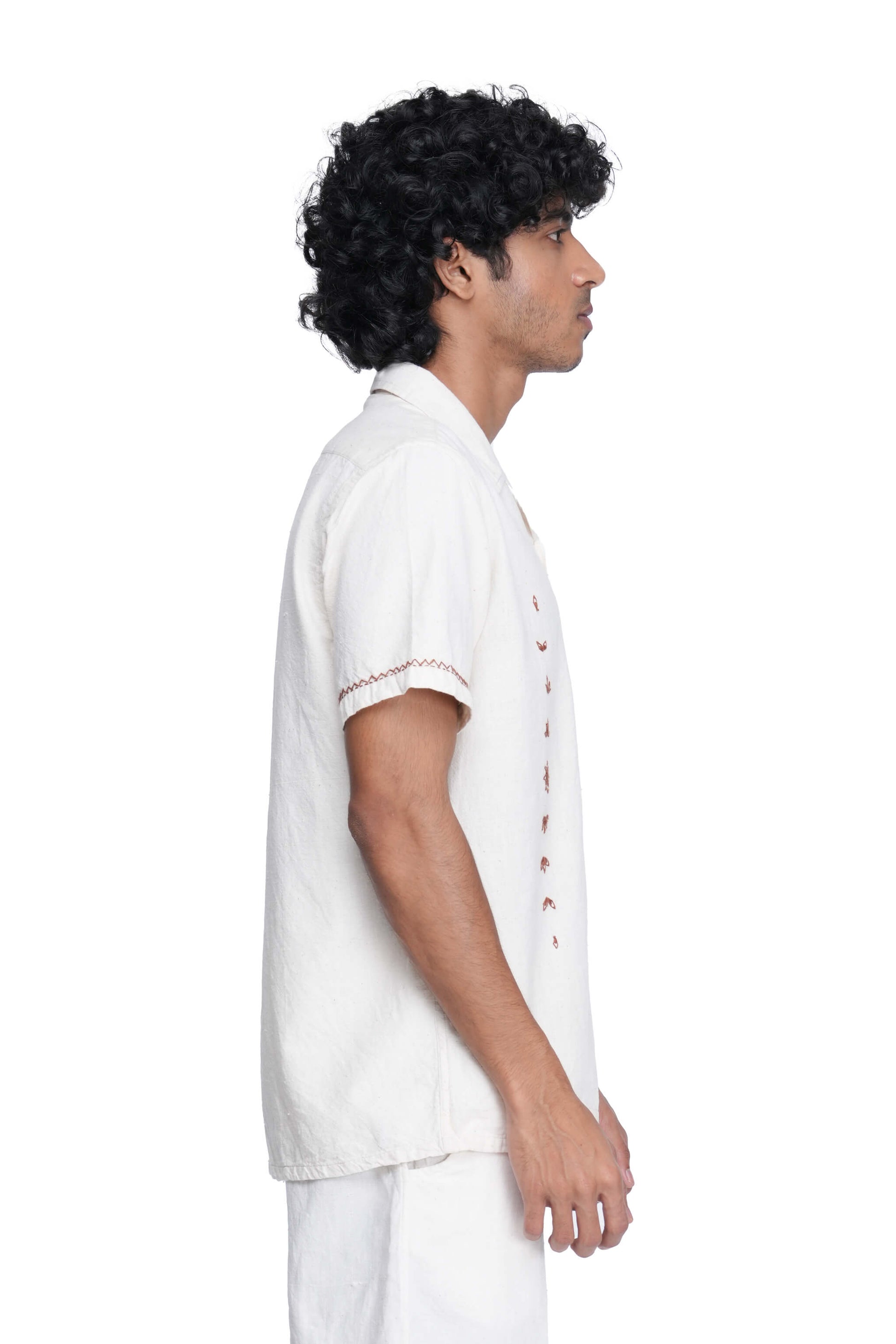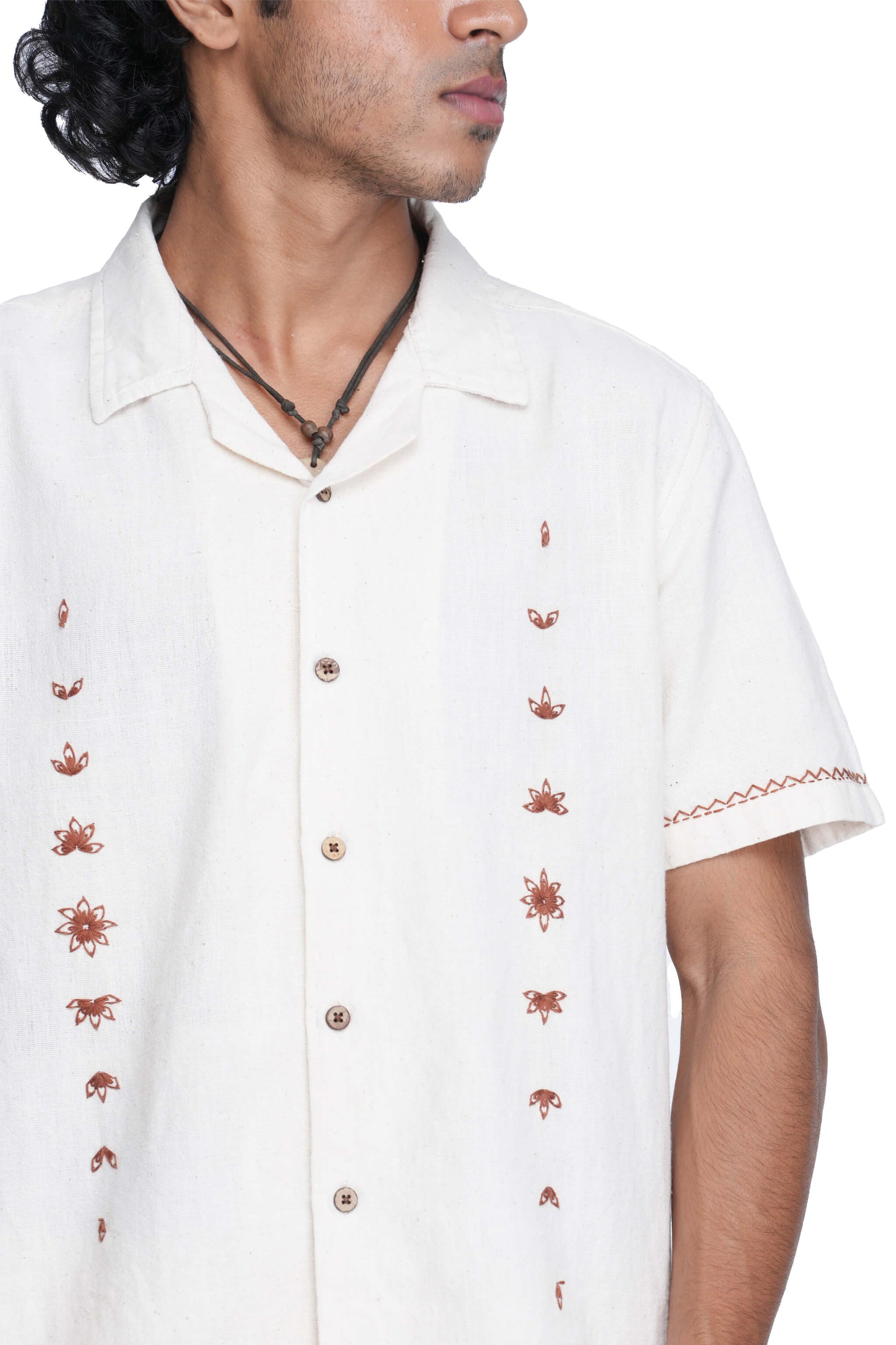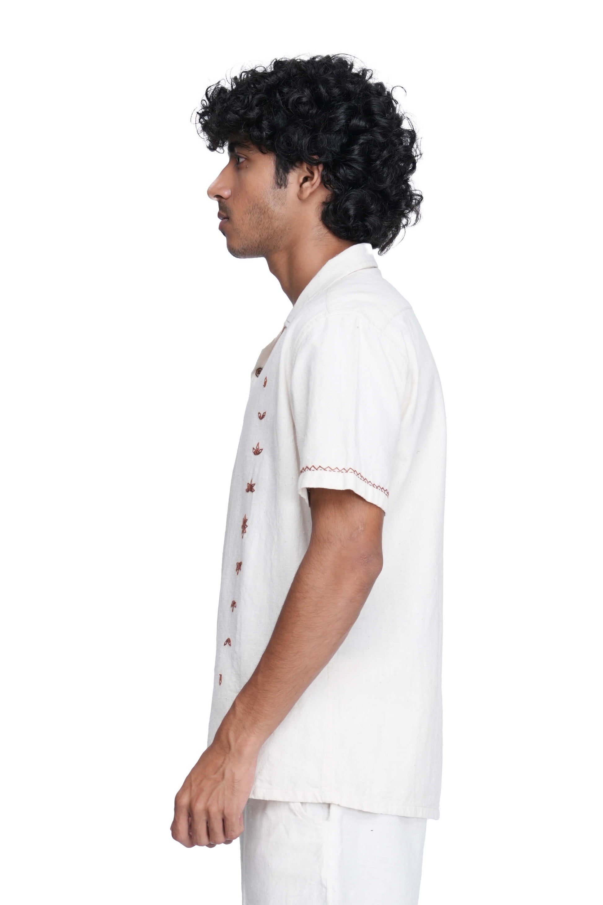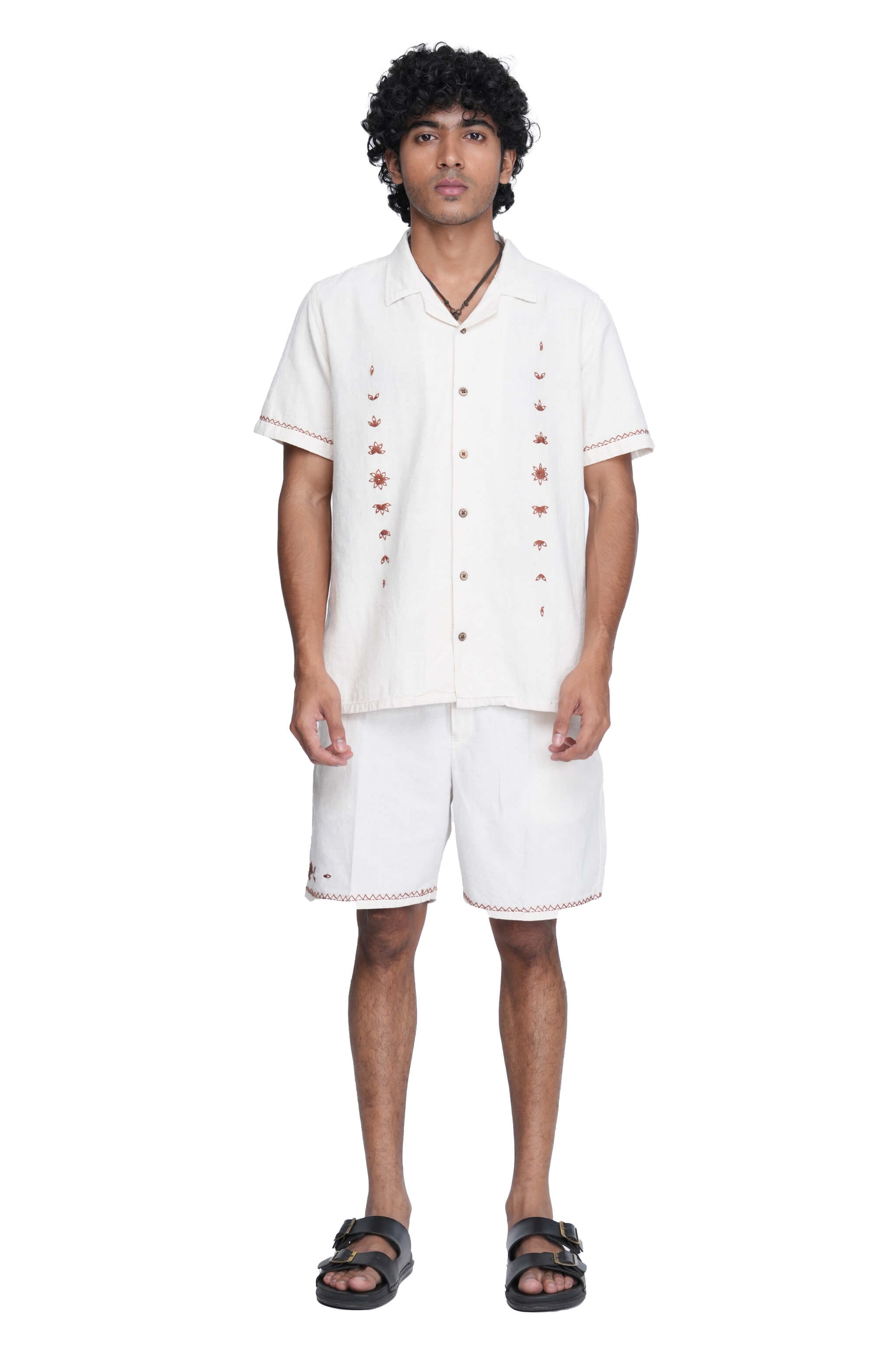 This S/S 25 collection shirt is made entirely of handloom cotton. airy and light, making it perfect for all-day wear. Half-sleeve hand embroidered shirt paired with matching shorts. Crafted with soft and breathable handwoven cotton.