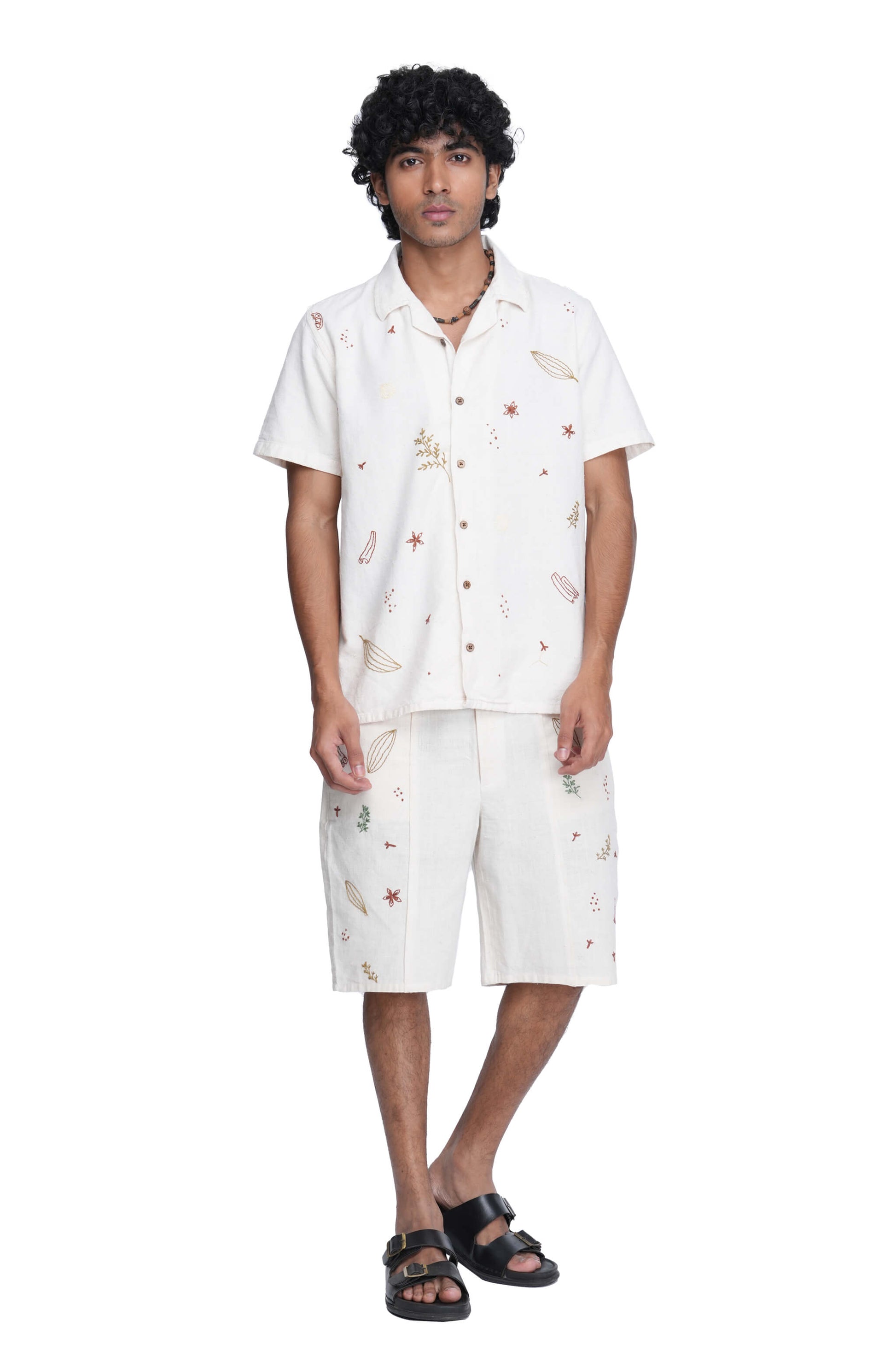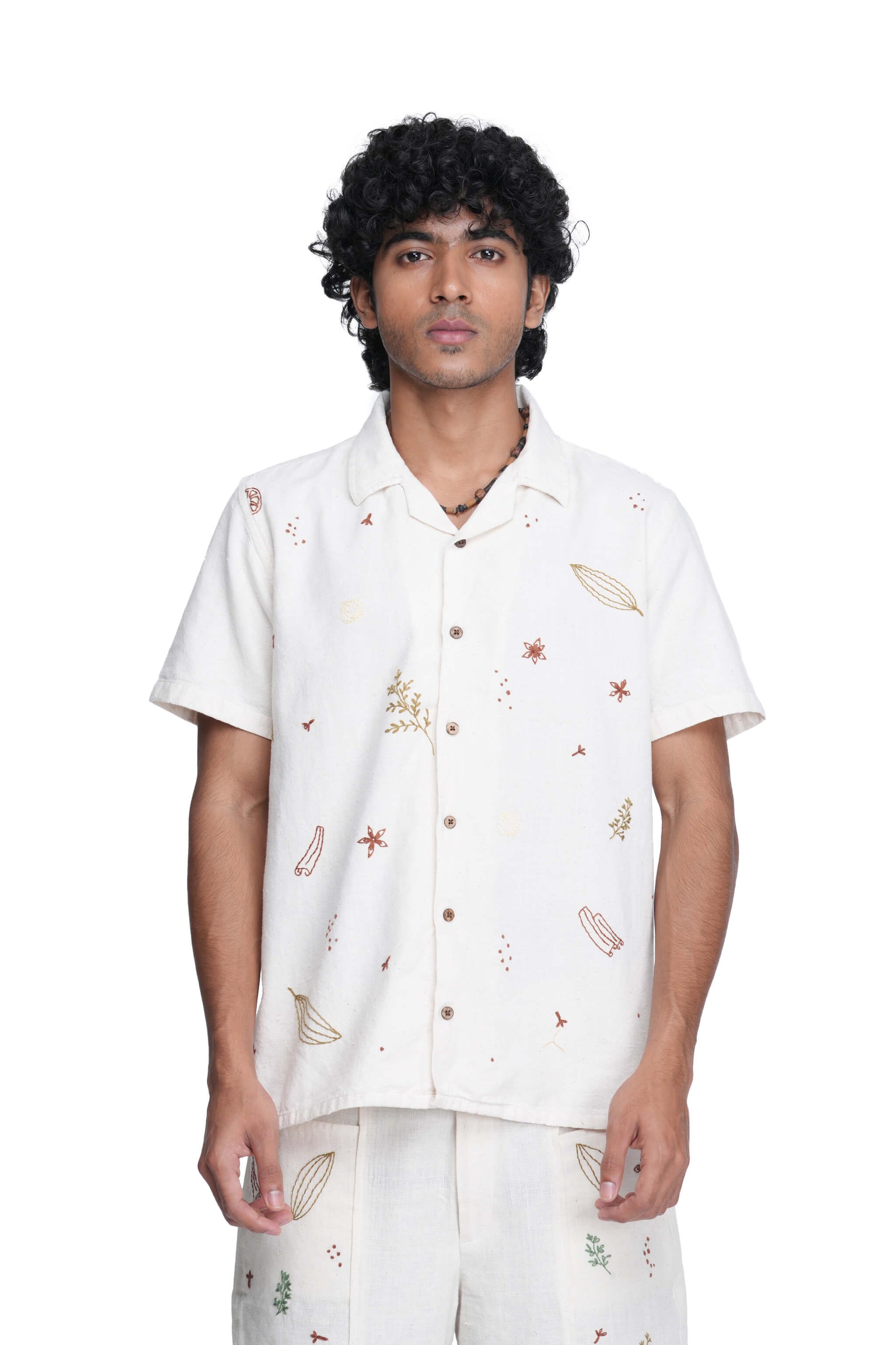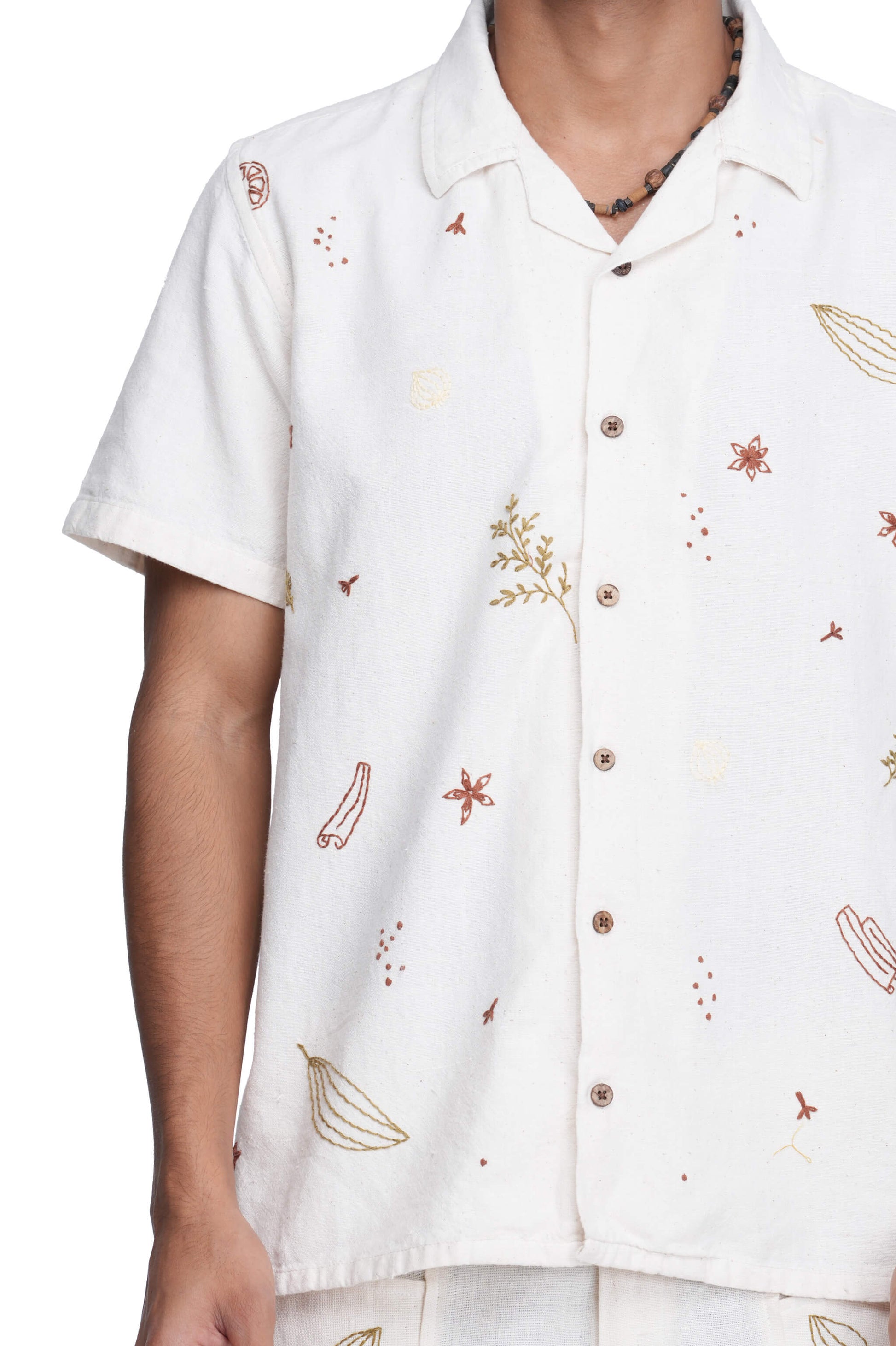 This S/S 25 collection shirt is made entirely of handloom cotton. airy and light, making it perfect for all-day wear. This matching panel shorts and shirt co-ord set have unique spice motifs all over.