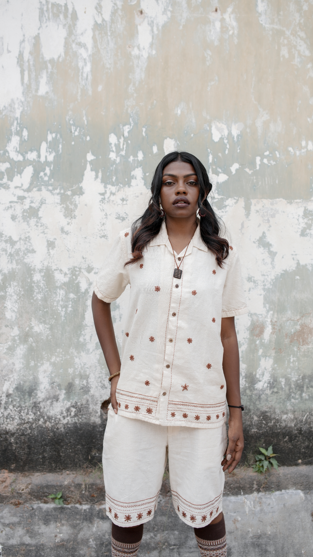 This S/S 25 collection shirt is made entirely of handloom cotton. airy and light, making it perfect for all-day wear.The set is adorned with delicate hand-embroidered star anise motifs, scattered across both the shirt and shorts.