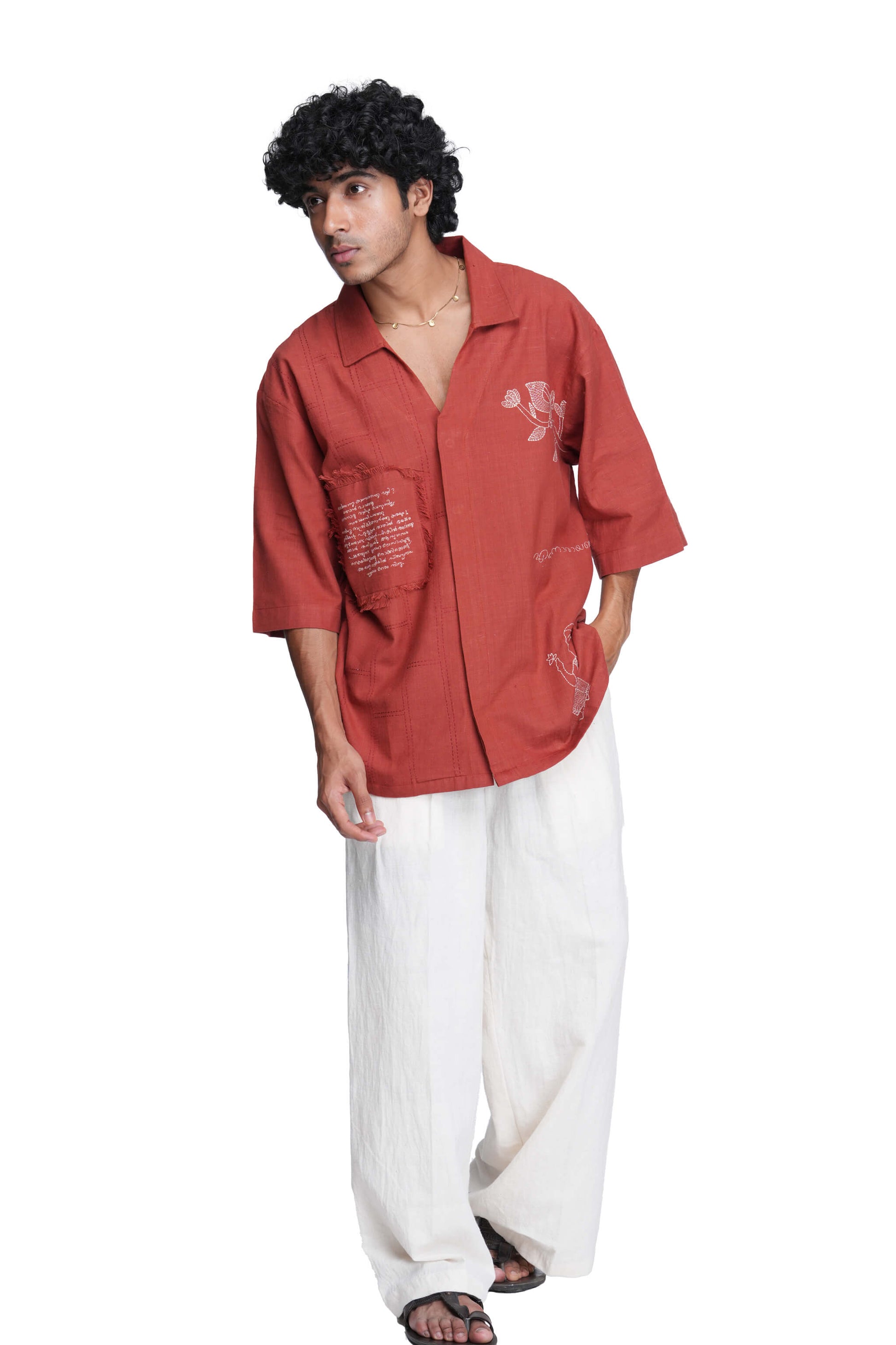 The Rosapoo Shirt is crafted in soft, breathable fabric and detailed with embroidered rose motifs on both sides, symbolising the quiet romance between Basheer and Narayani. The sleeves carry subtle threadwork as a nod to the unseen yet deeply felt presence of the beloved.