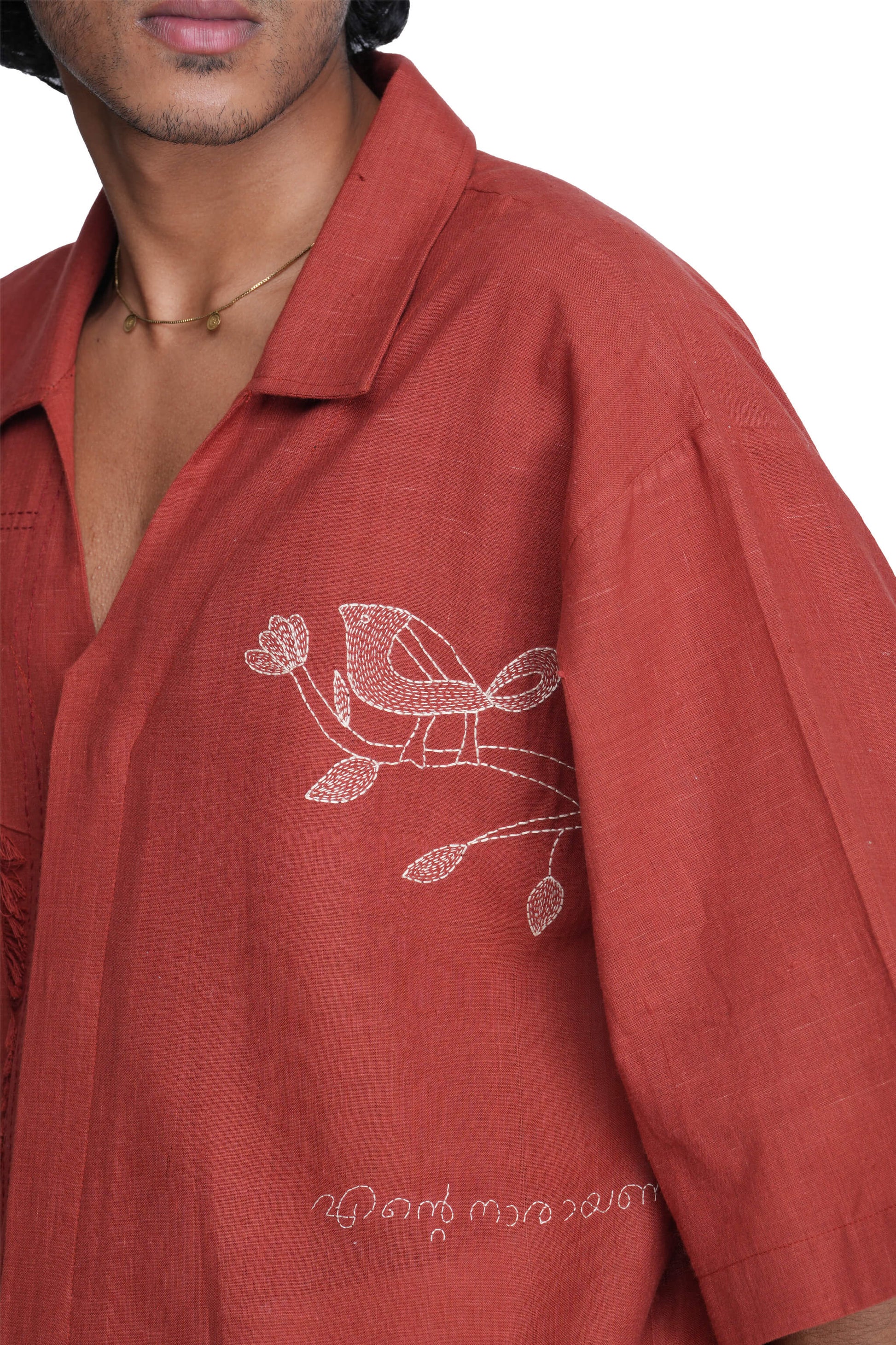 This S/S 25 Basheer Kadhakal collection shirt is made entirely of handloom cotton. airy and light, making it perfect for all-day wear. Half-sleeve hand embroidered shirt. Crafted with soft and breathable handwoven cotton.