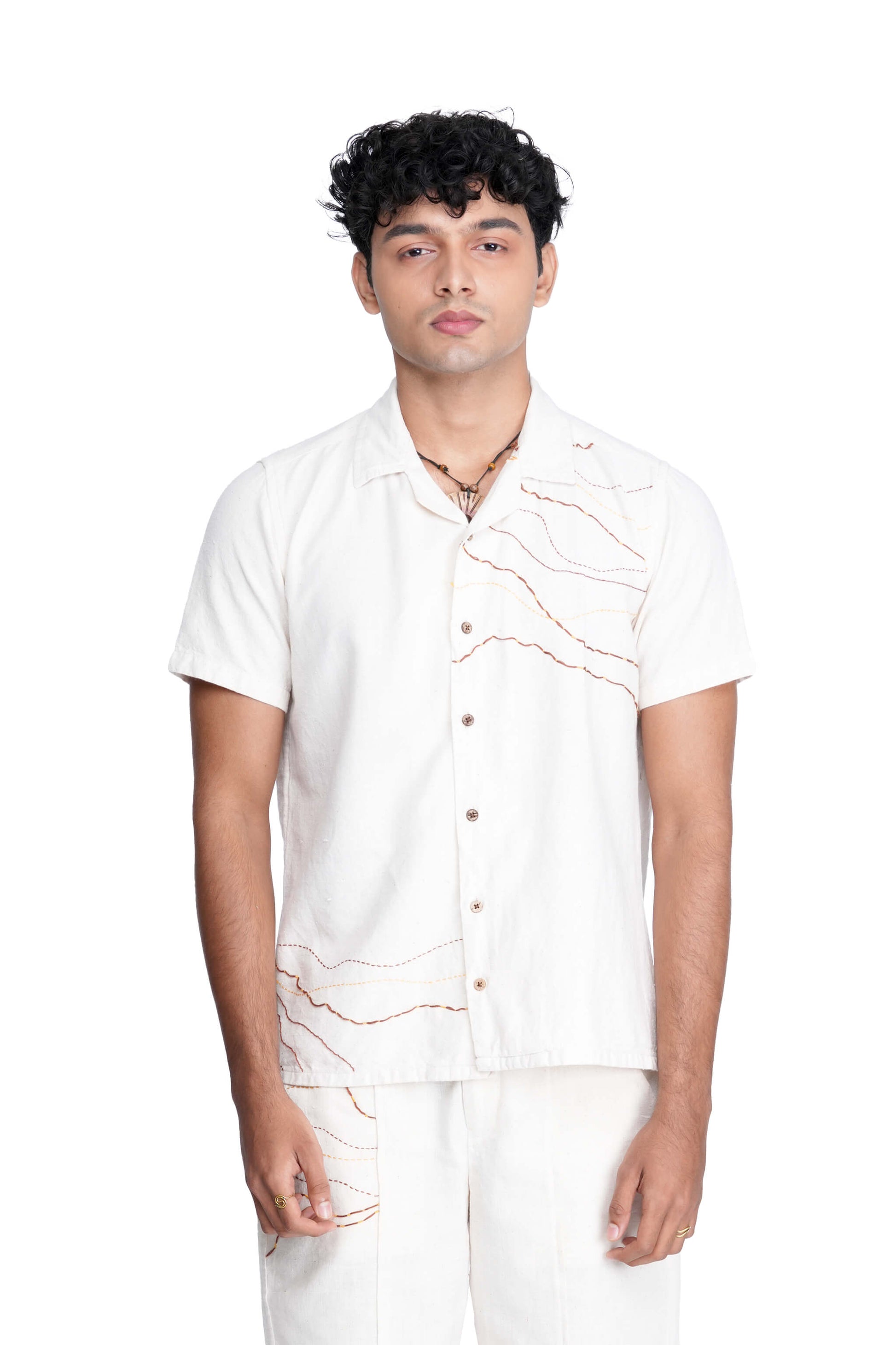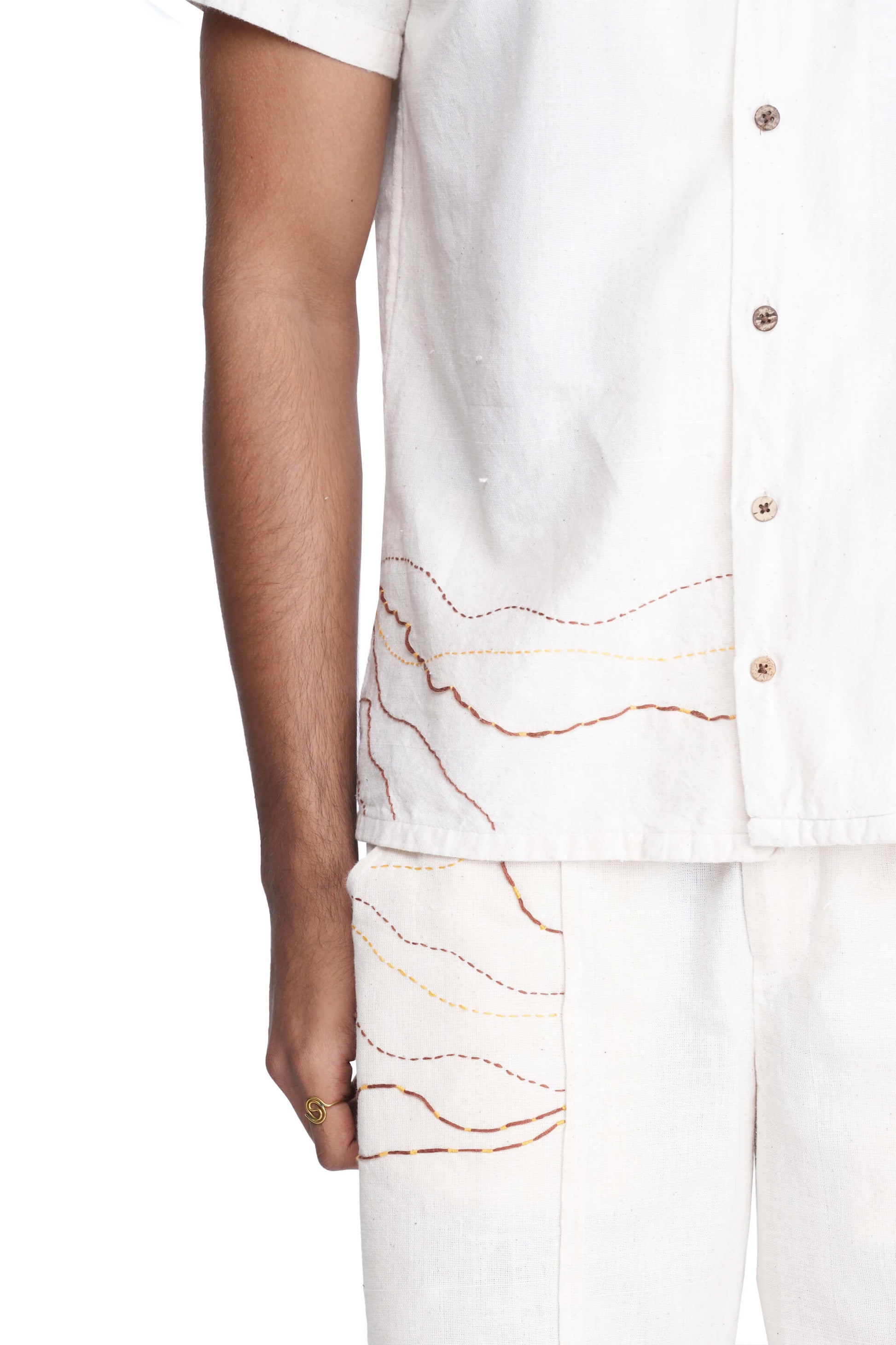 This S/S 25 collection shirt is made entirely of handloom cotton. airy and light, making it perfect for all-day wear. Crafted with soft, light and yet comfortable spice route hand embroidered cotton shirt paired with shorts.