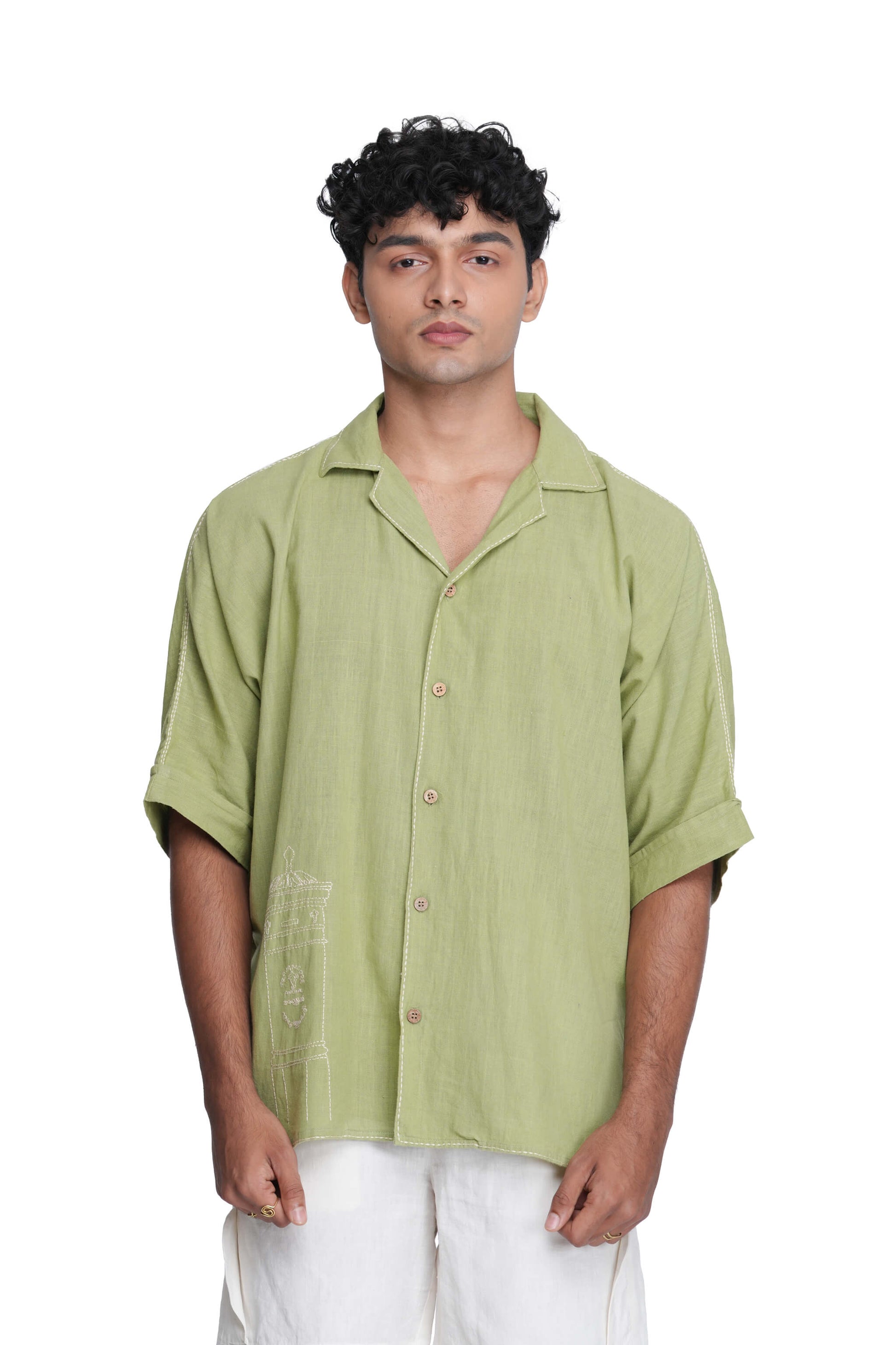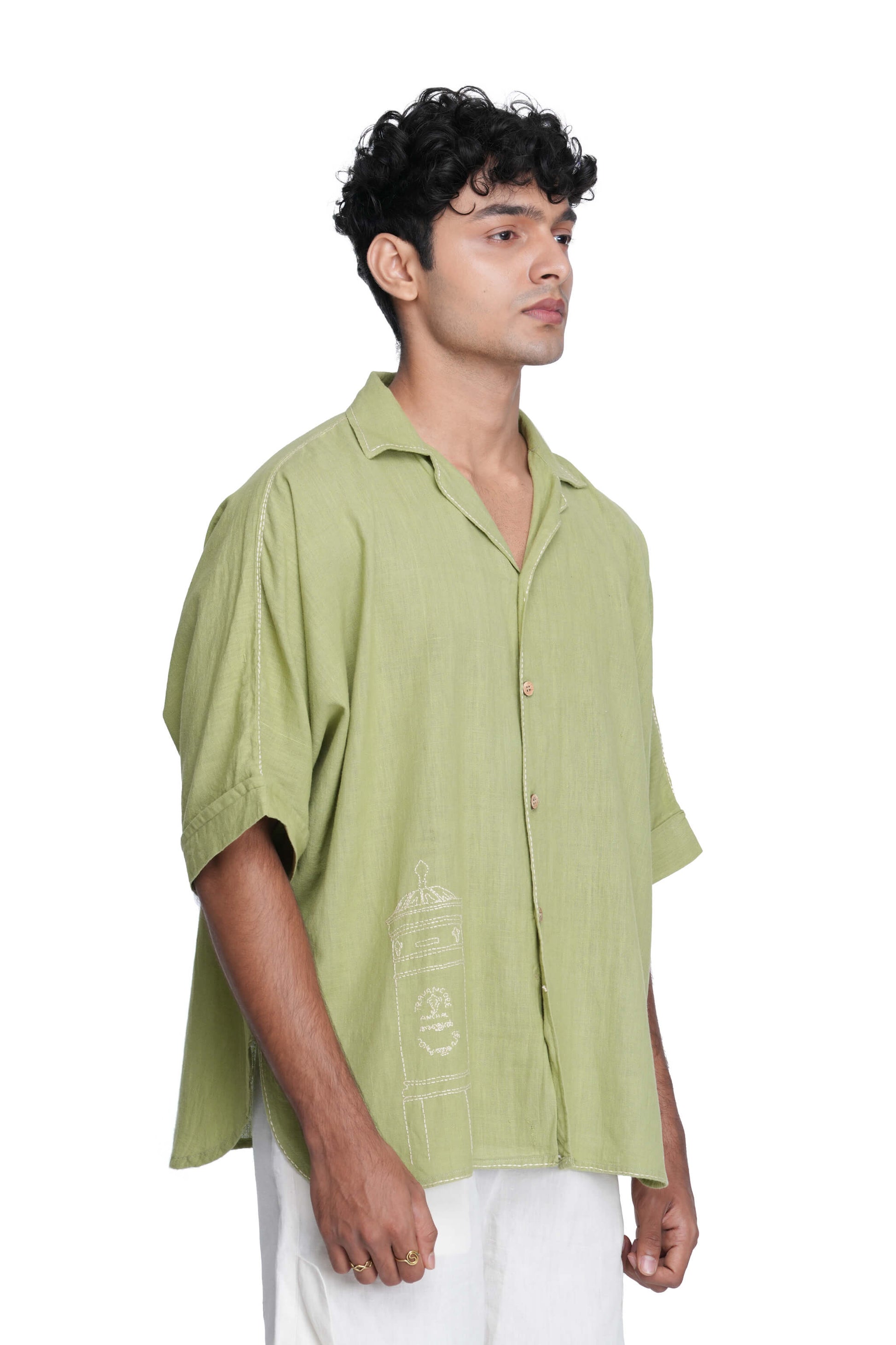 This S/S 26 stamp collection shirt is made entirely of handloom cotton. airy and light, making it perfect for all-day wear.