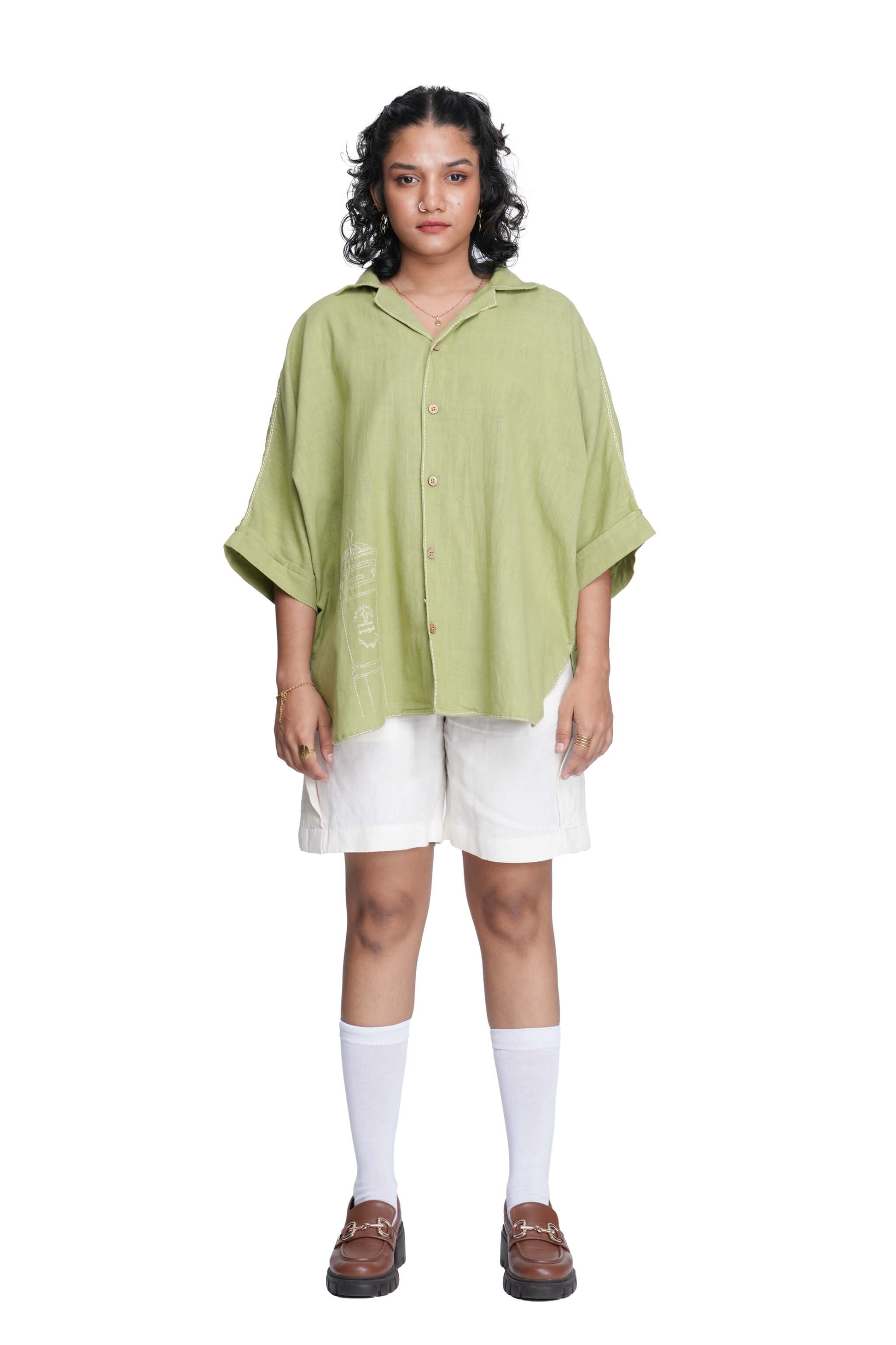 This S/S 26 stamp collection shirt is made entirely of handloom cotton. airy and light, making it perfect for all-day wear.