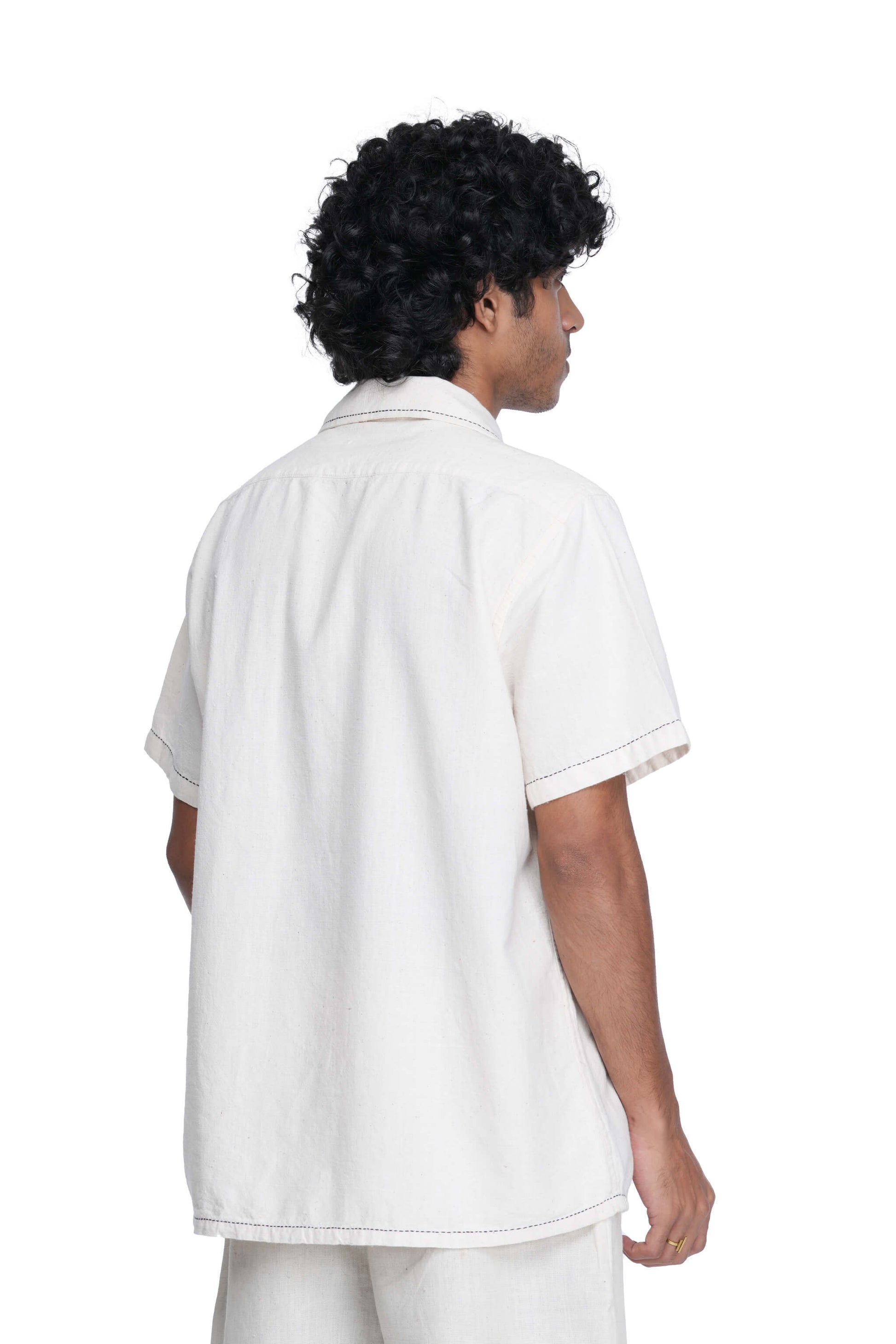 This S/S 26 stamp collection shirt is made entirely of handloom cotton. airy and light, making it perfect for all-day wear.